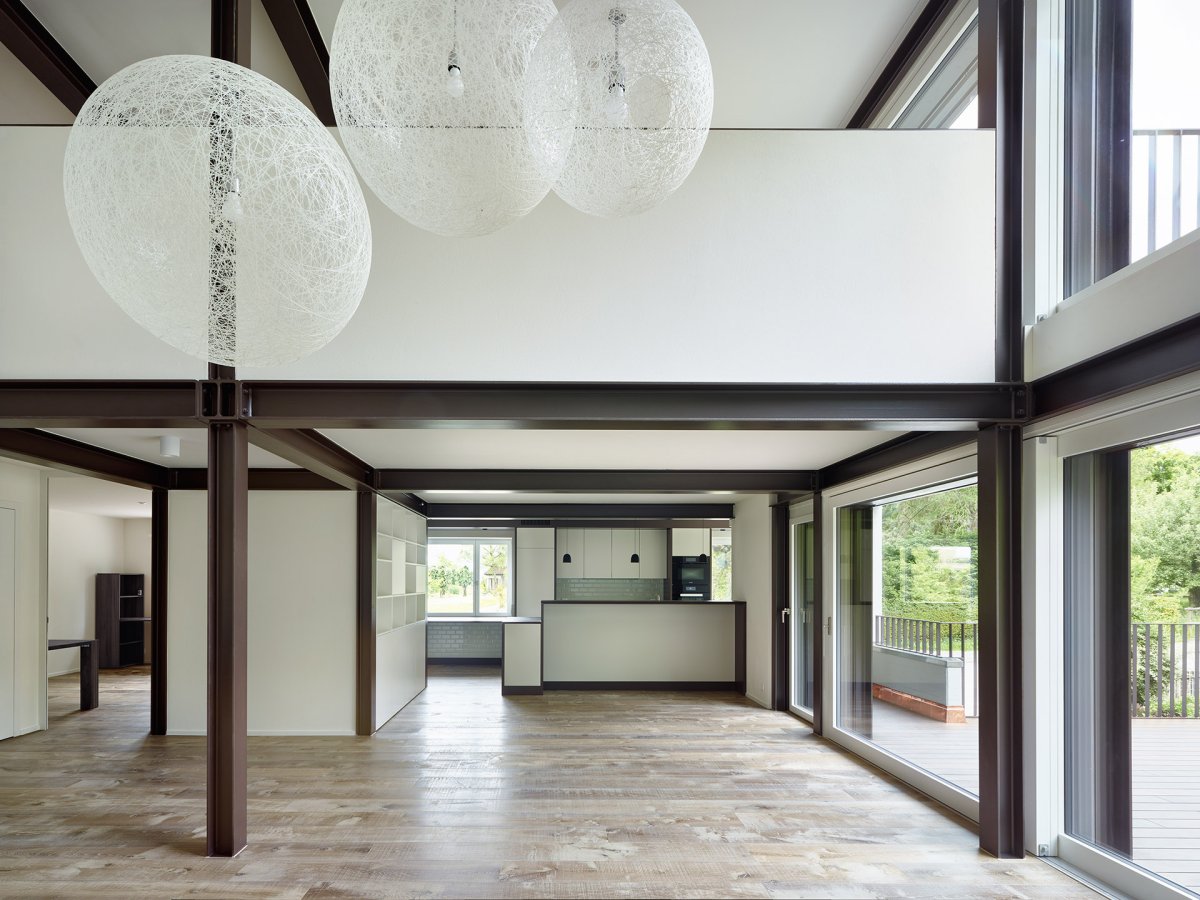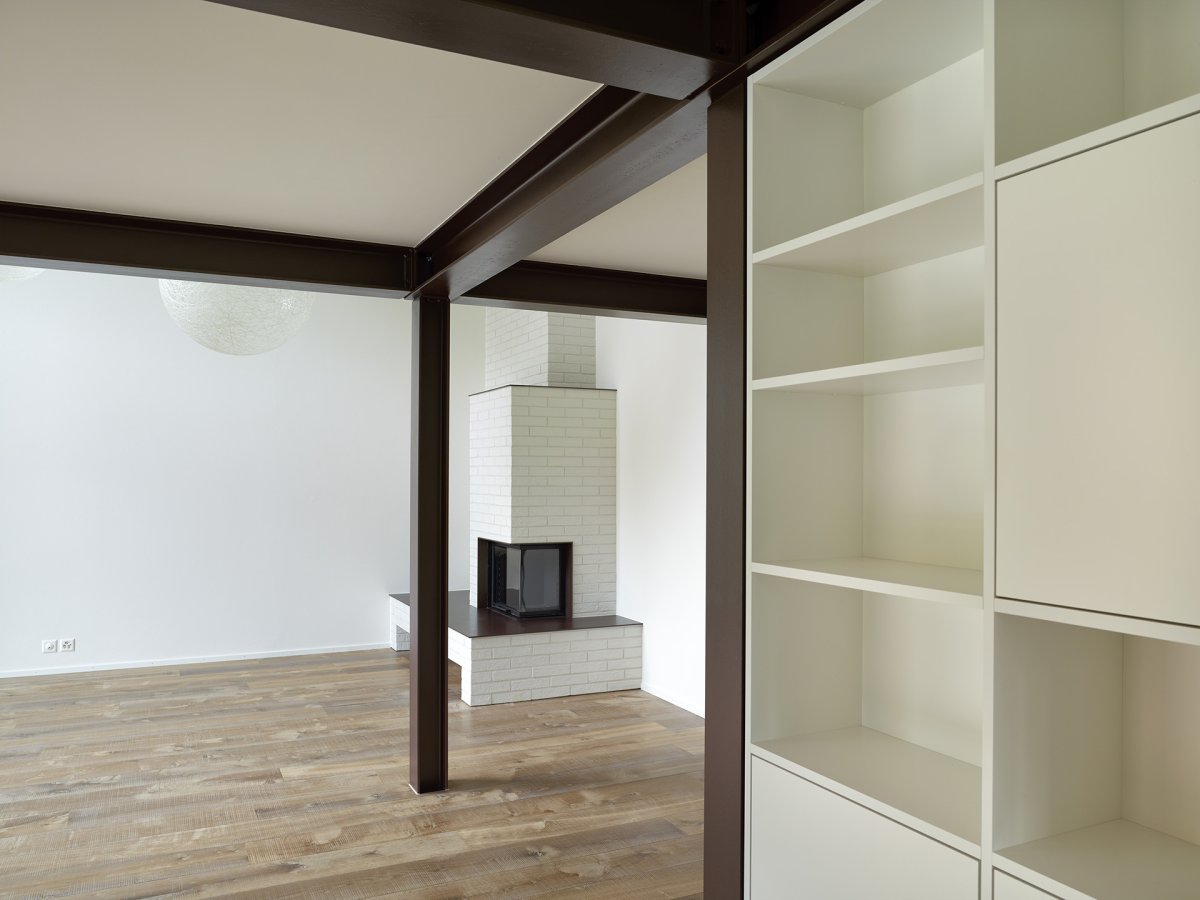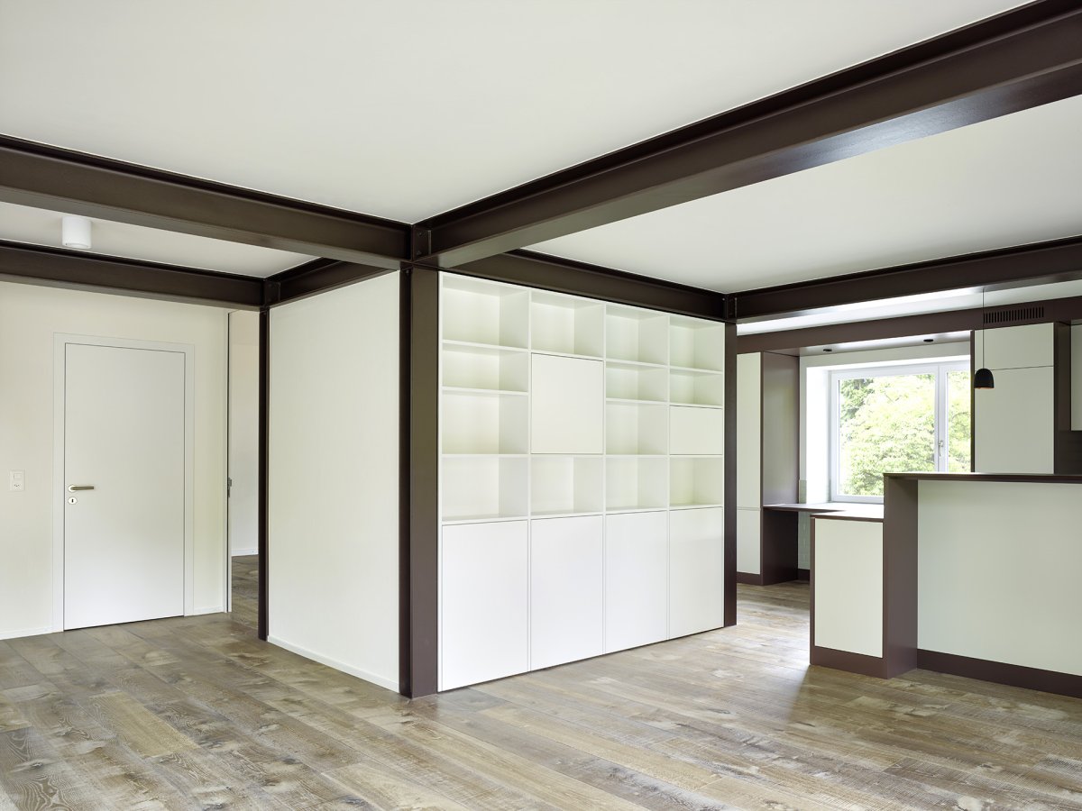 Anstatt die Stahlträger zu verkleiden, werden sie bewusst gezeigt und ziehen sich durch das ganze Haus bis unter das Dach. Sie überlagern sich mit der Raumstruktur im Leichtbau und verschmelzen mit den Einbaumöbeln.