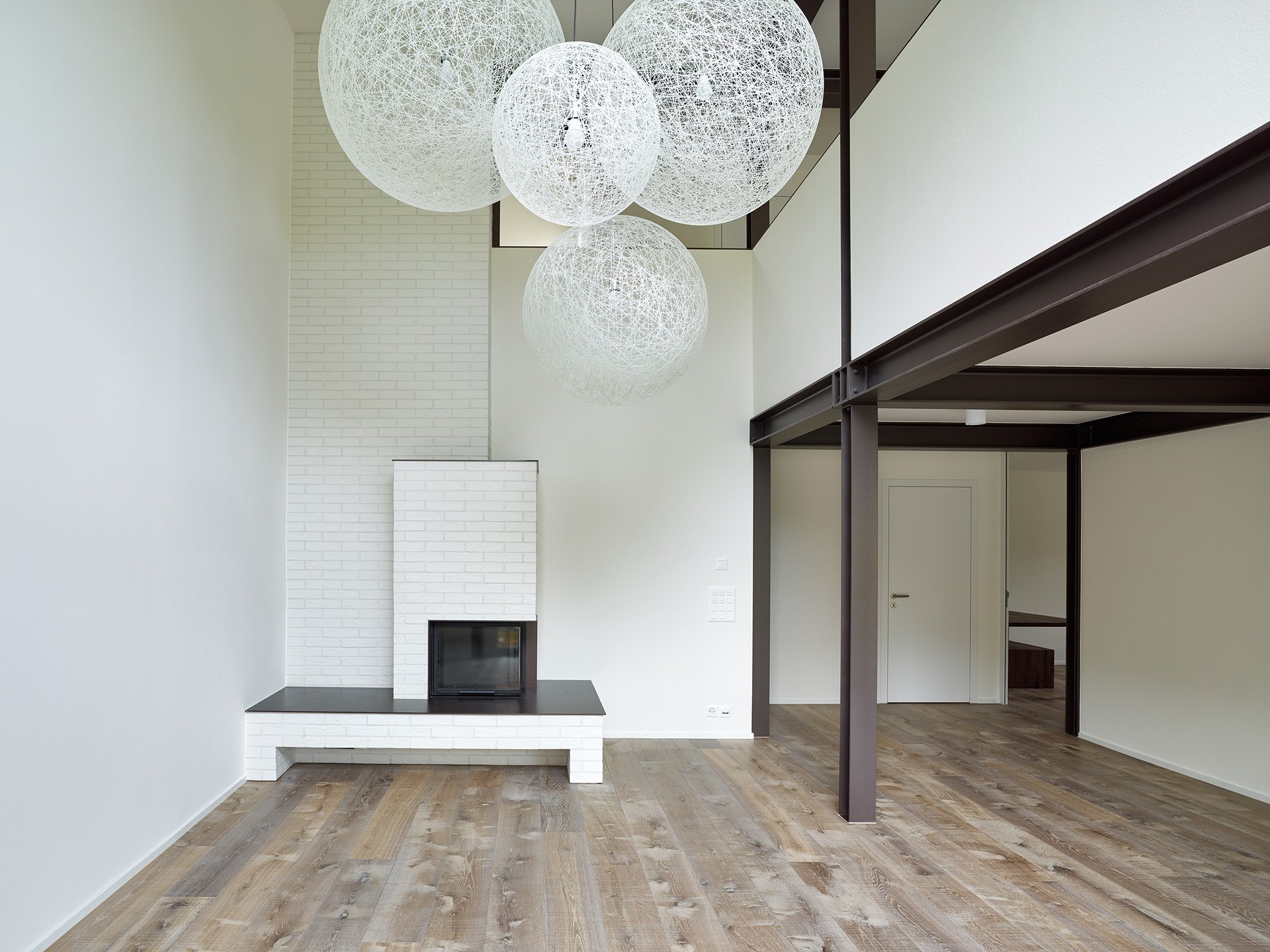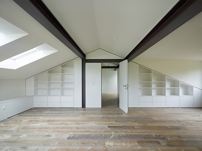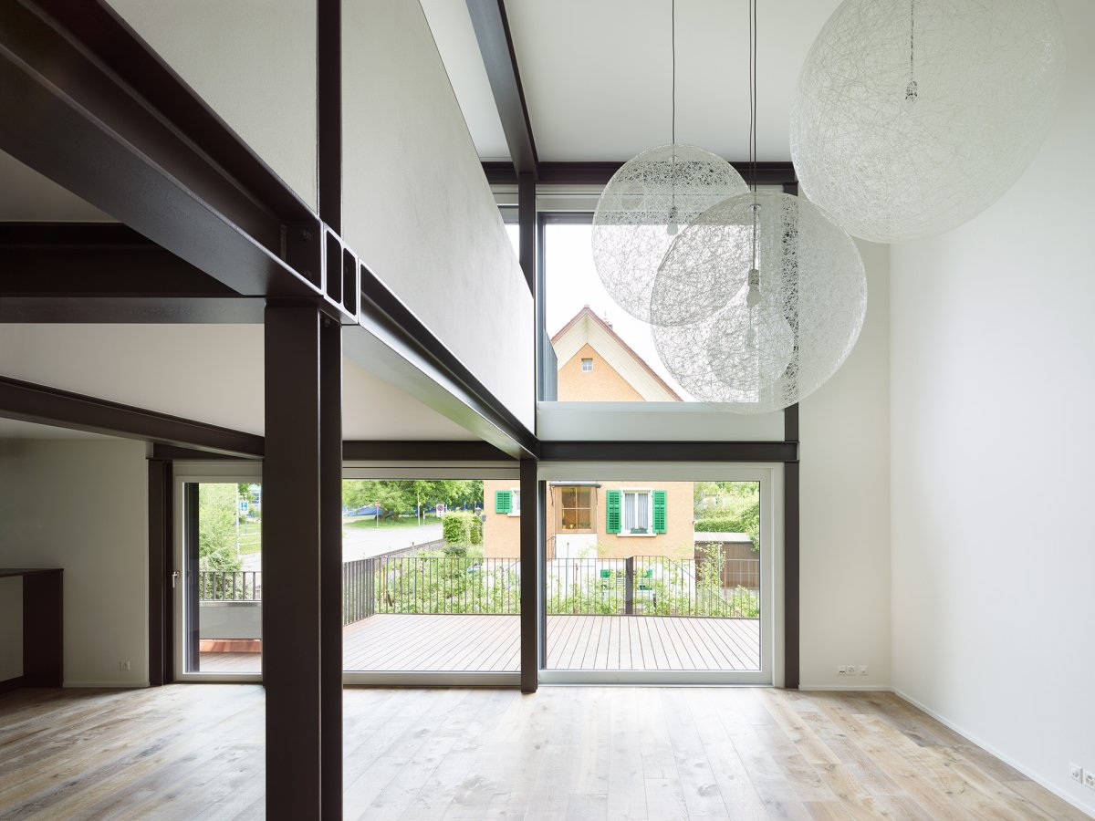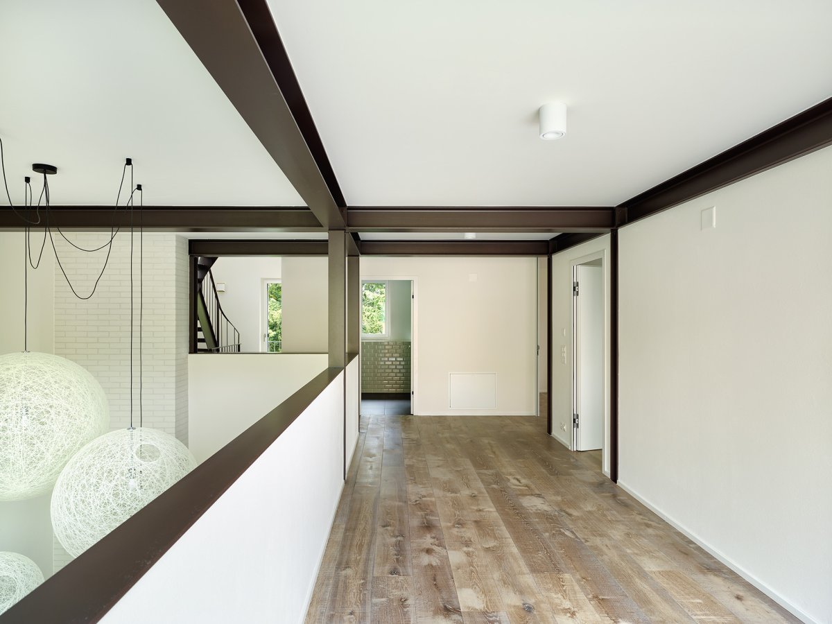 Anstatt die Stahlträger zu verkleiden, werden sie bewusst gezeigt und ziehen sich durch das ganze Haus bis unter das Dach. Sie überlagern sich mit der Raumstruktur im Leichtbau und verschmelzen mit den Einbaumöbeln.