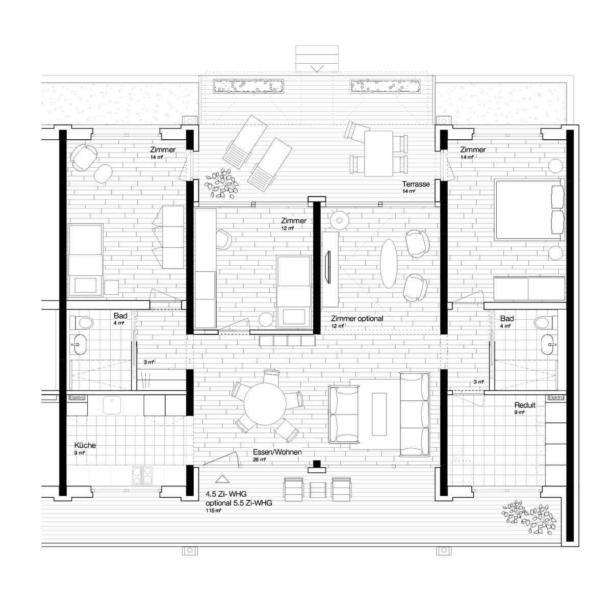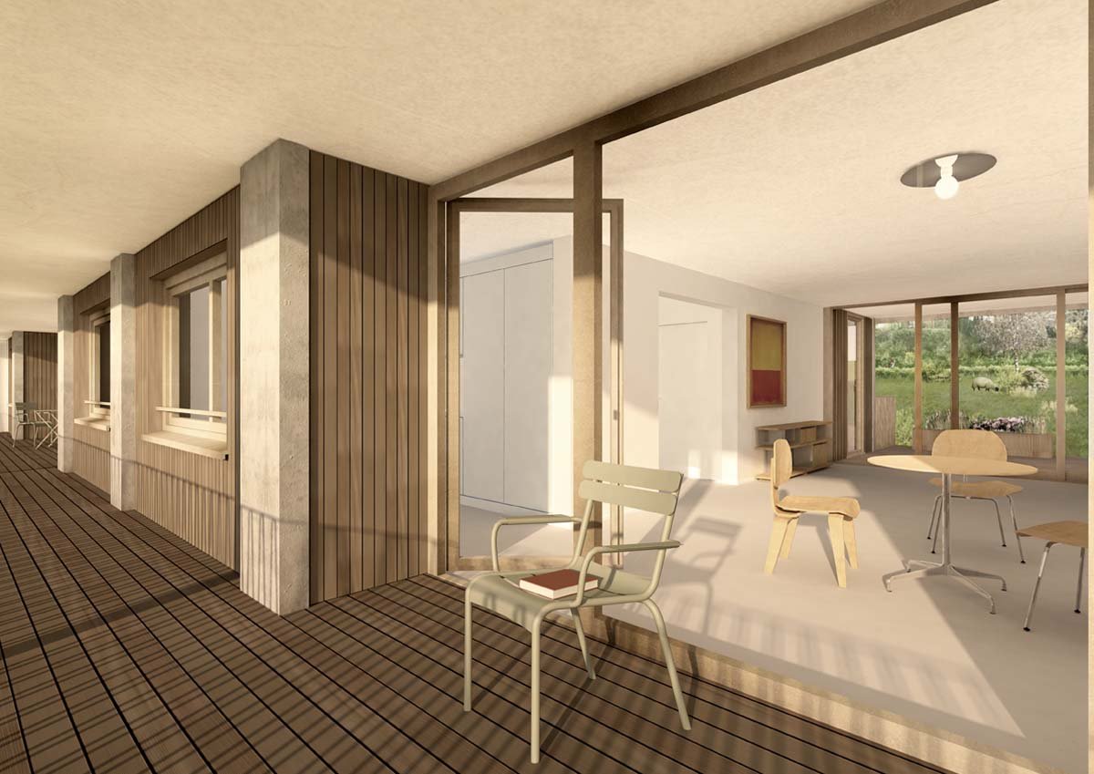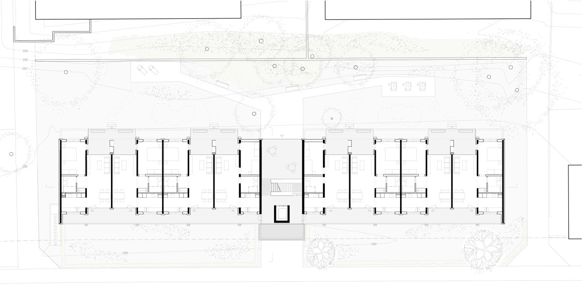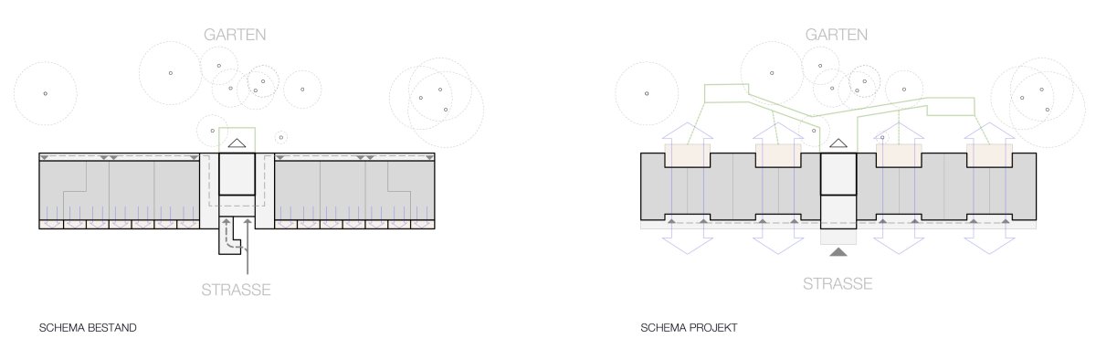 Warum sich auf die Strasse gegen Nordwesten orientieren, wenn gegen Südosten ein Garten mit schönen Bäumen lockt? Neu befindert sich also der Laubengang im Nordwesten zur Strasse hin. In Kombination dazu werden die bestehenden zwei Treppenhäuser auf eines reduziert. Dies ergibt eine klare Adressierung, reduziert die Erschliessungfläche und schafft mehr Fläche für die Wohnungen. Somit können zwei zusätzliche Wohnungen angeboten werden.