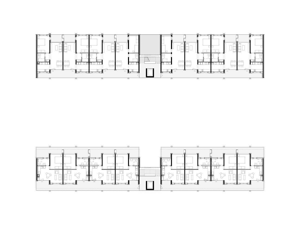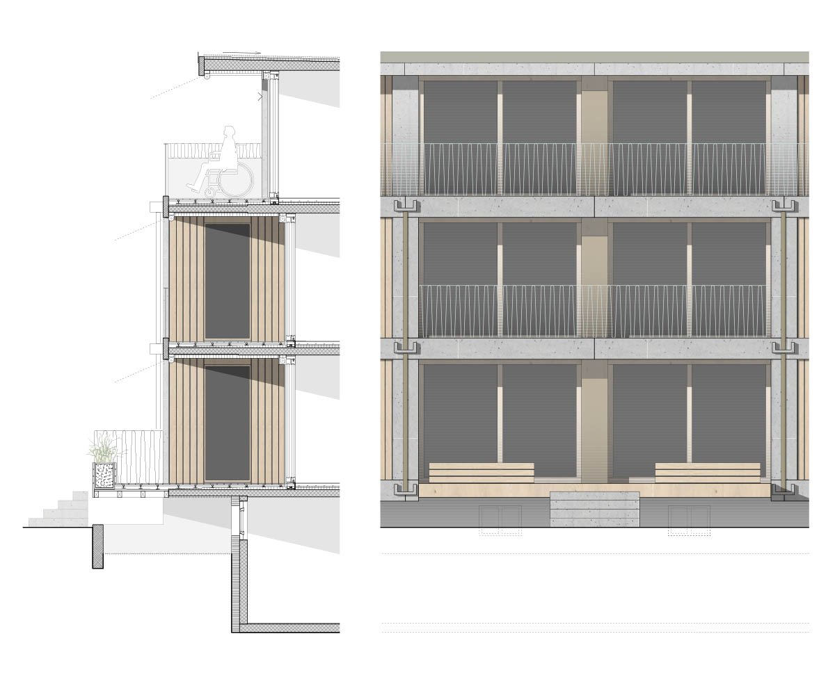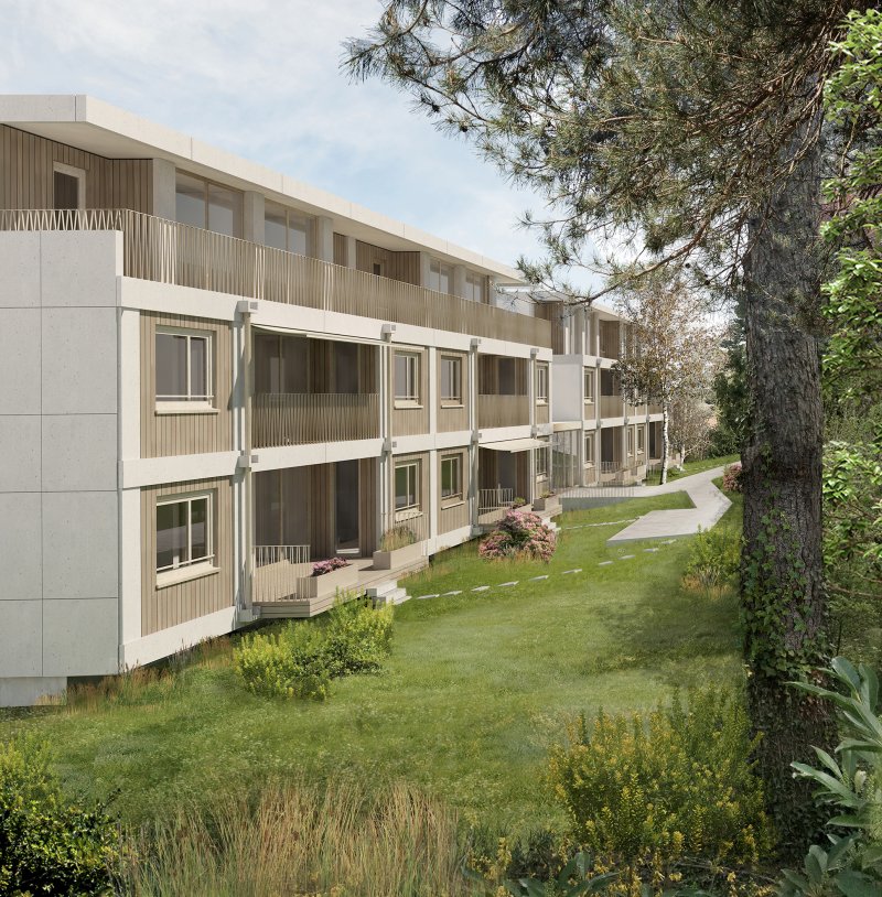 Warum sich auf die Strasse gegen Nordwesten orientieren, wenn gegen Südosten ein Garten mit schönen Bäumen lockt? Neu befindert sich also der Laubengang im Nordwesten zur Strasse hin. In Kombination dazu werden die bestehenden zwei Treppenhäuser auf eines reduziert. Dies ergibt eine klare Adressierung, reduziert die Erschliessungfläche und schafft mehr Fläche für die Wohnungen. Somit können zwei zusätzliche Wohnungen angeboten werden.