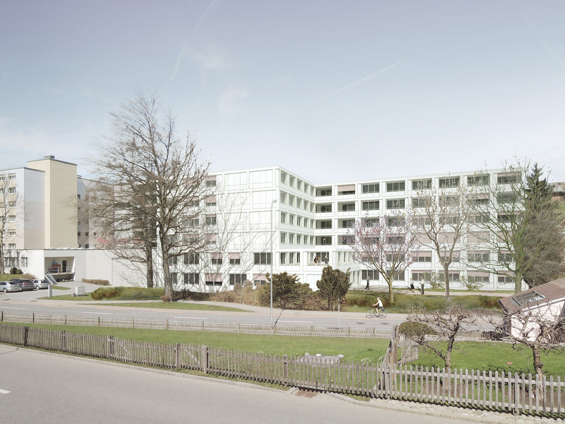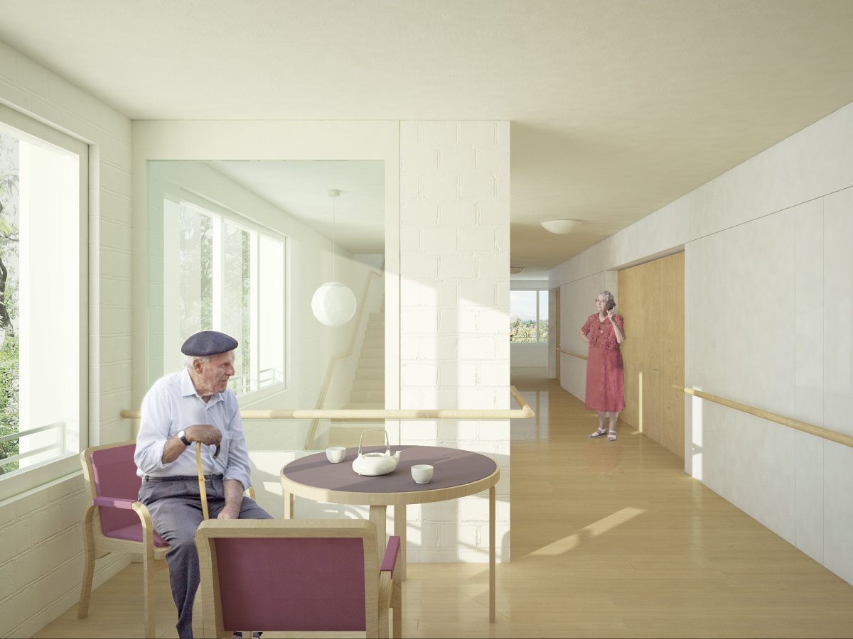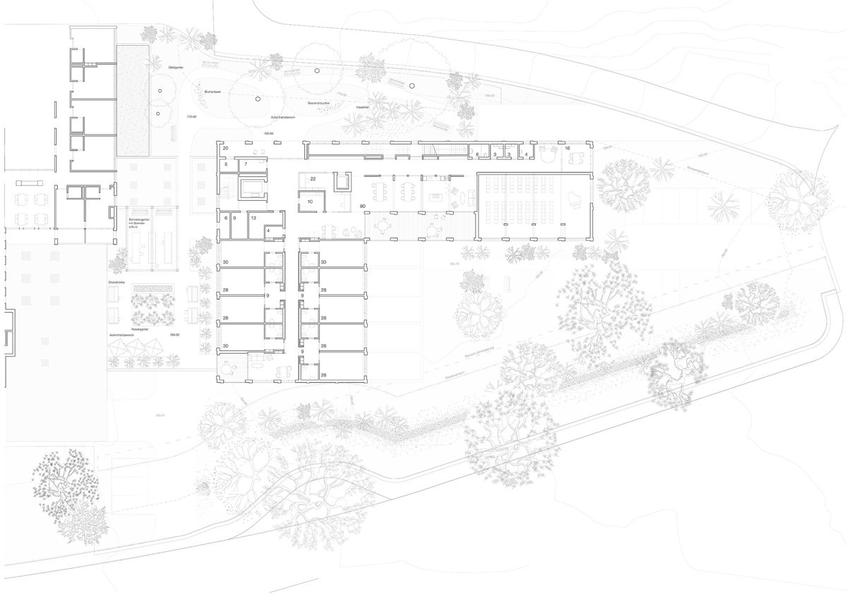 Die Nachfrage nach Betreuungsplätzen übersteigt das Angebot, v.a. weil ein Bestandsgebäude einer anderen Nutzung zugeführt wird. Es soll also ein Erweiterungsbau mit 60 Betten geplant werden. Zur Verfügung steht ein spitz zulaufendes Grundstück auf der Rückseite des Bestandsgebäude, wo sich die Anlieferung befindet. Dort muss auch ein Geländeversprung überwunden werden. Die Erweiterung orientiert sich in der Volumetrie am Bestand und nimmt einen respektvollen Bezug auf zu den umliegenden, recht unterschiedlichen Siedlungsstrukturen. Ausserdem lässt es genügend Platz für einen qualitätvollen Aussenraum.