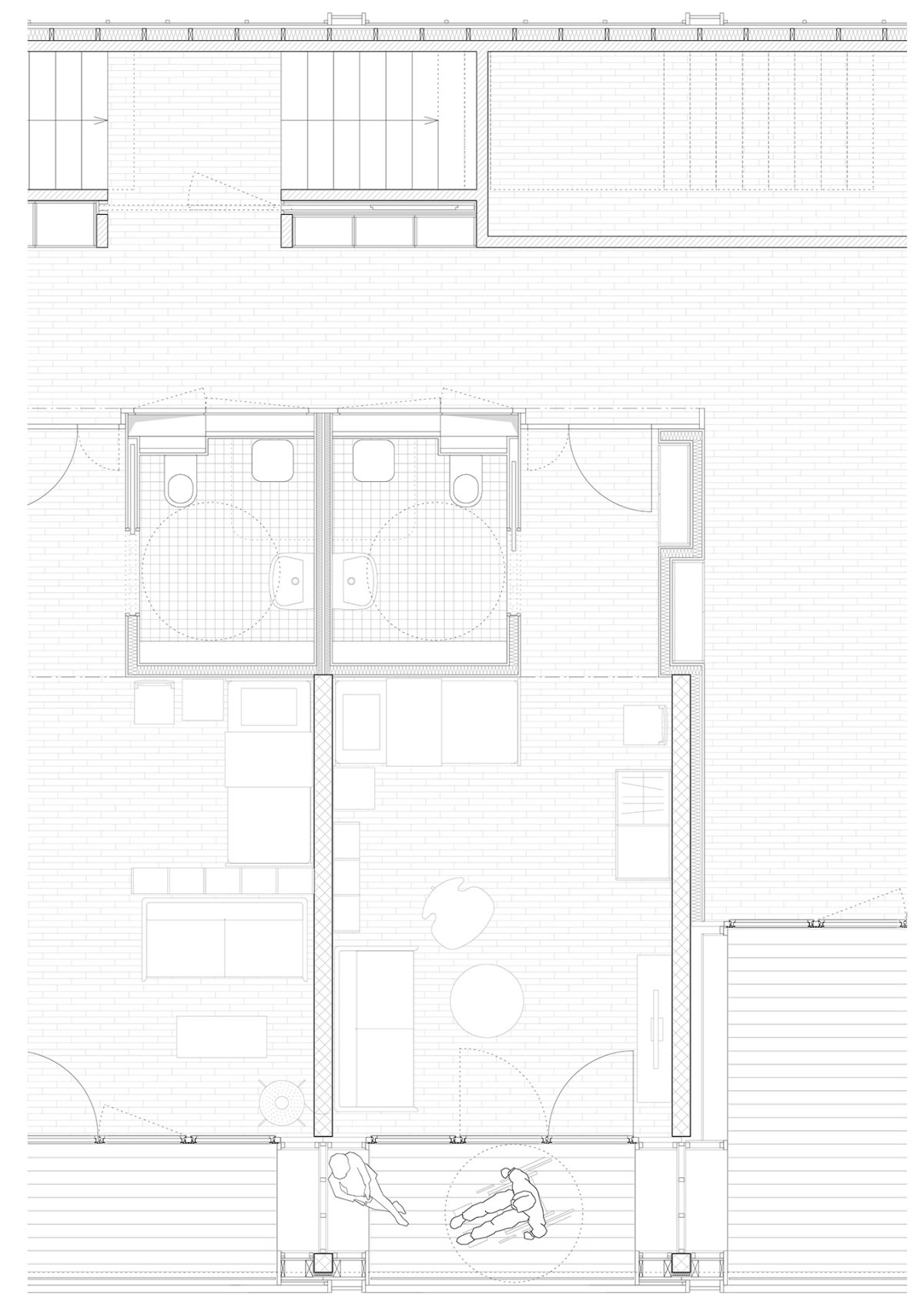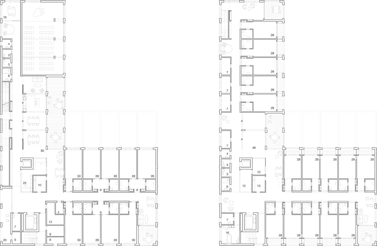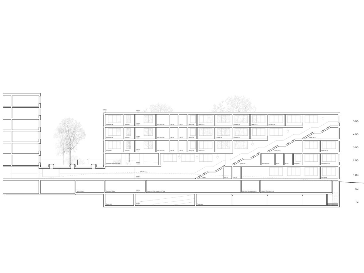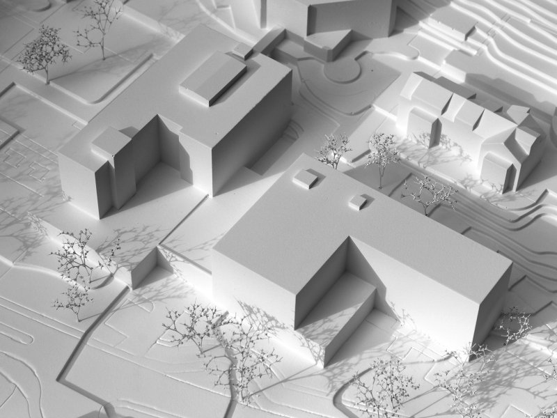 Die Nachfrage nach Betreuungsplätzen übersteigt das Angebot, v.a. weil ein Bestandsgebäude einer anderen Nutzung zugeführt wird. Es soll also ein Erweiterungsbau mit 60 Betten geplant werden. Zur Verfügung steht ein spitz zulaufendes Grundstück auf der Rückseite des Bestandsgebäude, wo sich die Anlieferung befindet. Dort muss auch ein Geländeversprung überwunden werden. Die Erweiterung orientiert sich in der Volumetrie am Bestand und nimmt einen respektvollen Bezug auf zu den umliegenden, recht unterschiedlichen Siedlungsstrukturen. Ausserdem lässt es genügend Platz für einen qualitätvollen Aussenraum.