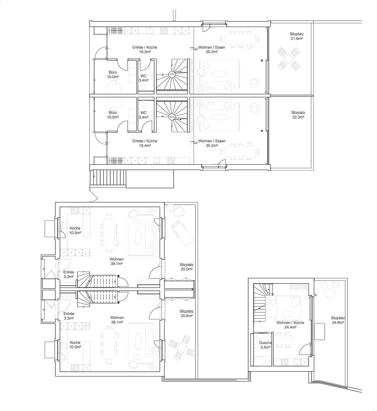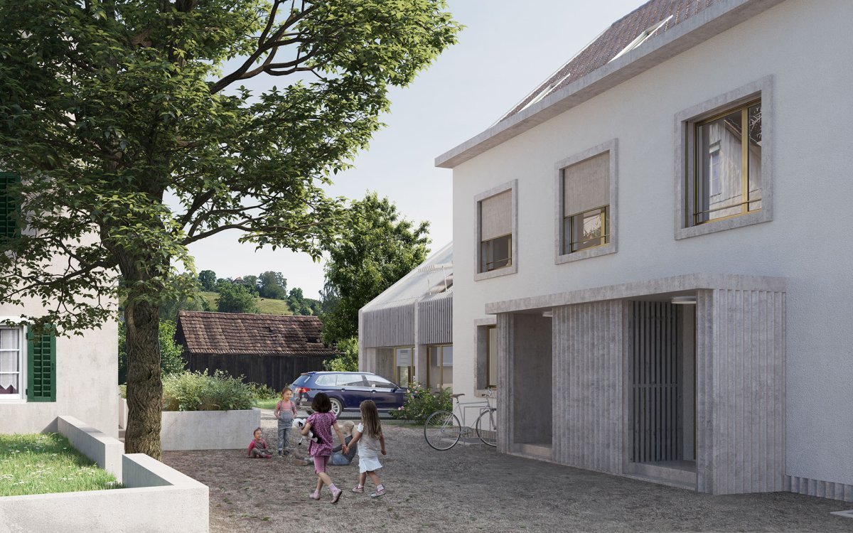 Die neuen Einfamilienhäuser befinden sich mitten im historischen Zentrum. Um den lauschigen Innenhof, welcher sich aus der historischen Bauernhofsituation ergibt, gruppieren sich drei Gebäude - das bestehende Wohnhaus an der Usterstrasse, das ehemalige Ökonomiegebäude und ein zurück versetztes Wohnhaus. Ebenfalls dazu gehört die ehemalige Moststube sowie ein zusätzlicher Neubau.